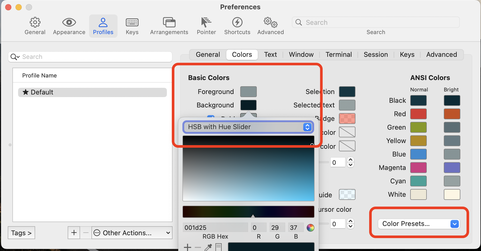 두 번쨰는 Profiles에 들어가서 Color를 셋팅하는데, 보통 Color Presets...는 Dark Solarized로 하는 편이고, 거기서 조금 더 어둡게 가져가는 편이다.