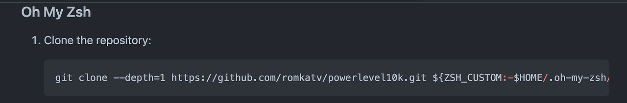 git clone --depth=1 https://github.com/romkatv/powerlevel10k.git ${ZSH_CUSTOM:-$HOME/.oh-my-zsh/custom}/themes/powerlevel10k