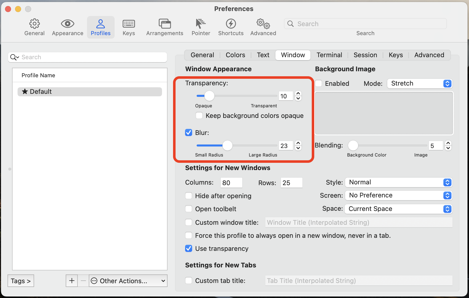 세 번째는 Window로 넘어가서 Transparency와 Blur를 설정해주는데 나는 오차 3~4에서 딱 저 정도가 눈에 잘 보이는 것 같다.