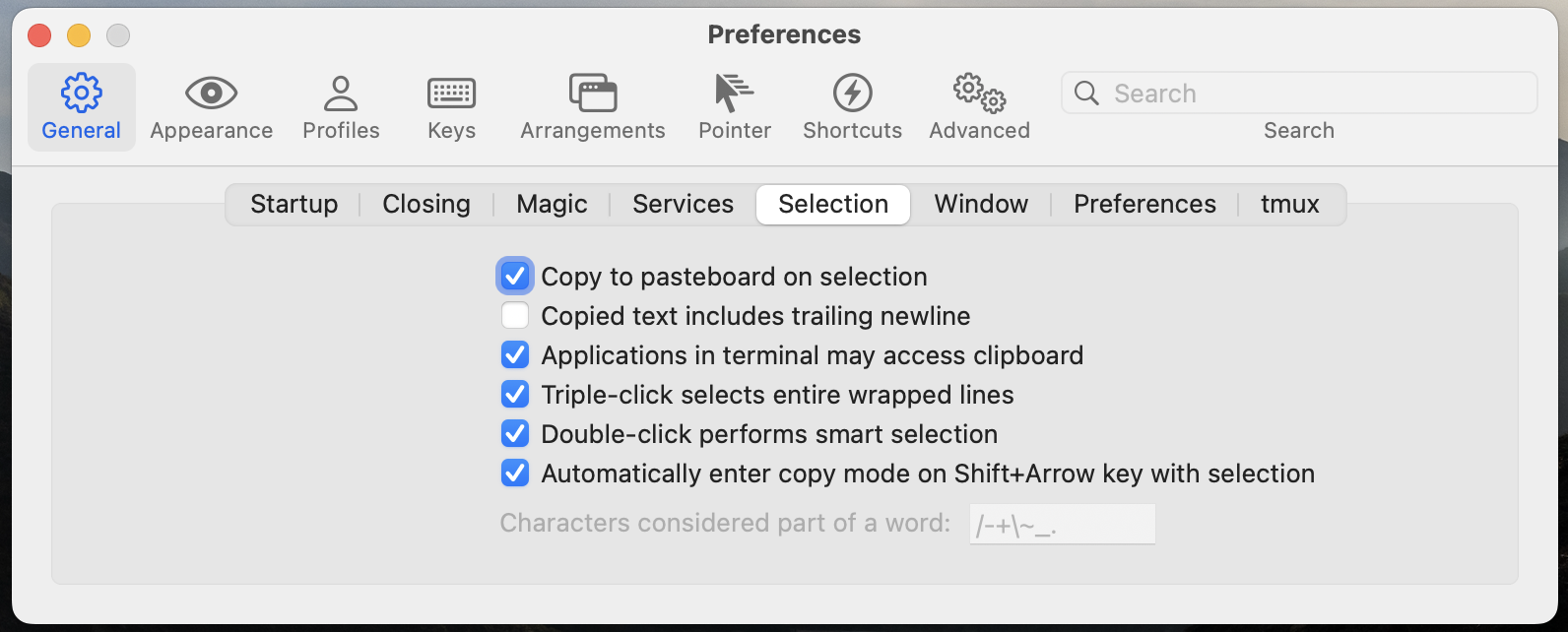 우선 General > Selection에 들어가서 Applications in terminal may access clipboard를 체크해준다.